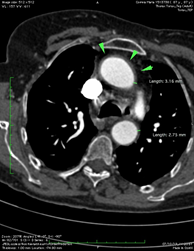 Figure 1 On axial Angio-CT slice, Diffuse thickening of the ascendent and descending aorta are indicated by green arrowheads and green line.