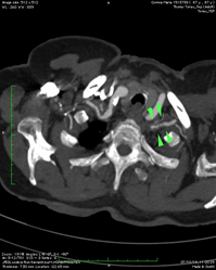 Figure 2 On axial Angio-CT slice, stenosis of the left subclavian artery with an inflammatory component is indicated by green arrows.