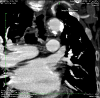 Blood tests revealed no changes, except an Erythrocyte sedimentation rate (ESR) of 56m, and C-reactive protein (CRP) of 44 mg/L. Plasma and urinary catecholamine levels were within the reference values. The autoimmunity study was negative. The electrocardiogram showed sinus rhythm, with a heart rate of 73 beats per minute, with no changes in rhythm, conduction, or ventricular repolarization. The 24-hour Holter confirmed the baseline sinus rhythm and some periods of 2nd-degree atrioventricular block Mobitz I during sleep. To complete de cardiac study, an echocardiogram was performed, which revealed mild mitral-aortic degenerative changes, aortic valve fibrosis, mitral ring calcification, mild regurgitation, and an enlarged left atrium. For the absence of palpable pulses, an Arterial Eco-Doppler of the Upper Limbs was performed, revealing a significant stenosis of the axillary arteries bilaterally, more severe on the right and with distal hemodynamic compromise. To exclude a Giant Cell Arteritis a Cerebral Vessel Wall MRI was performed and excluded changes in the temporal artery. Lastly, the Thoracic and Abdominal Angio-CT showed a diffuse thickening of the aorta wall, (Figure 1), stenosis of the left subclavian artery (Figure 2 & 3) with an inflammatory component, reduction in the caliber of the right subclavian artery and severe stenosis of the renal artery (Figure 4), thus suggesting a Takayasu Disease.