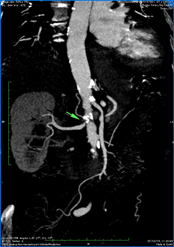 Figure 4 On coronal Angio-CT slice, severe stenosis of the right renal artery is indicated by a green arrow.