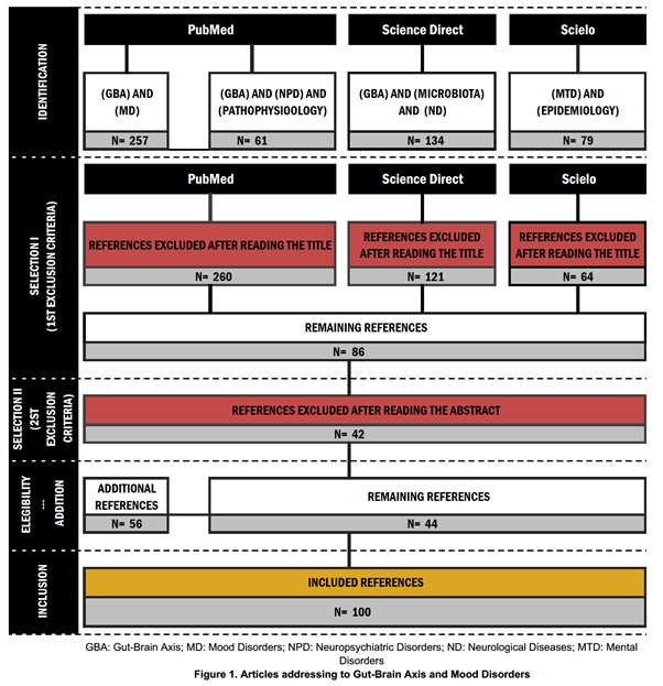 When entering Selection II and Eligibility, the second exclusion criteria was applied, having as analysis the articles´ abstracts and the elimination of those that did not present information that addressed or ratified the gut-brain axis´s function in the context of mood disorders. As a result, 42 articles were excluded and 44 were maintained for the Eligibility stage. Subsequently, 56 more articles were validated, since they brought additional information about animal tests that reinforce the research. Finally, in the Inclusion stage, a total of 100 original articles in English and Portuguese (including books, guidelines, chapters and case reports) remained.