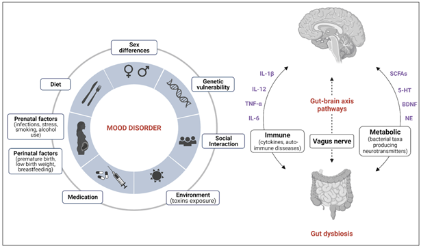 The development of mood disorders can be associated with a plethora of interactions of the gut, such as diet, sex differences, genetic vulnerability, enviroment, social interactions, medication and pregnancy outcomes (eg. prenatal factors and perinatal factors). Also, the gut and the brain's bidirectional communication it's been described to be made through an immune, metabolic and nervous pathways.