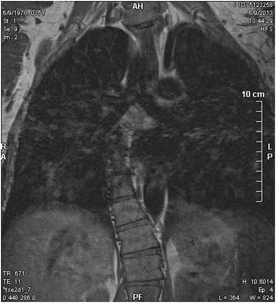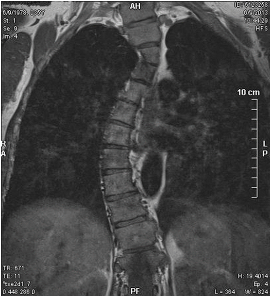 A 35-year old man, was admitted complaining of medium intensity back pain and progressive weakness of both lower extremities, worse on the left side. He had occasionally experienced ‘pins and needles’ sensation in the thoracic/abdominal region along with periods of gait disturbance. He was diagnosed by the age of 17 having a dextroscoliosis with Cobbs angle 24°. Several different bracing attempts had been made but with no improvement and he was told that the weakness of his left leg and atrophy was due to the increasing scoliosis. More than one and a half year before admission, his scoliosis had progressed with Cobbs angle advancing to 44° (Figure 1 & 2).