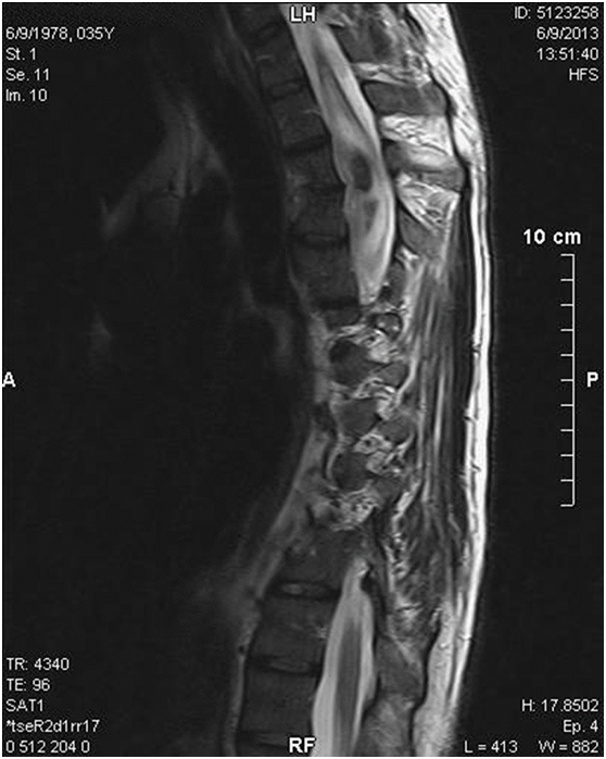 An attempt with a Regnier-Cheneau brace was tried but made him worse along with sudden spasticity, so, he was finally properly examined with an MRI of his thoracic spine. This showed an intramedullary lesion at D2-D5 level, with cranio-caudal length of 7 cm and cord width of 1,8cm (Figure 3 & 4).