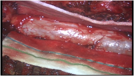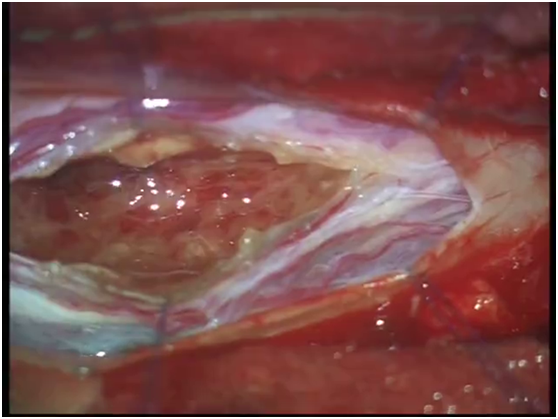 After a complementary 3D computerized tomography of his spine, the patient was brought to the operating theater and through a laminectomy at D2-D5 level the spinal cord was exposed showing a swelling due to an intramedullary lesion. The laminectomy was performed without muscle relaxants, thus allowing neuromonitoring of SEPs and MEPs. The dura was intact but tense and one could see through, a swollen cord and a cyst-like formation on the posterior aspect. By opening the arachnoid membrane a CSF containing cyst was emptied and dark green-bluish lesion appeared on the posterior and leftaspect of the cord (Figure 5-8).