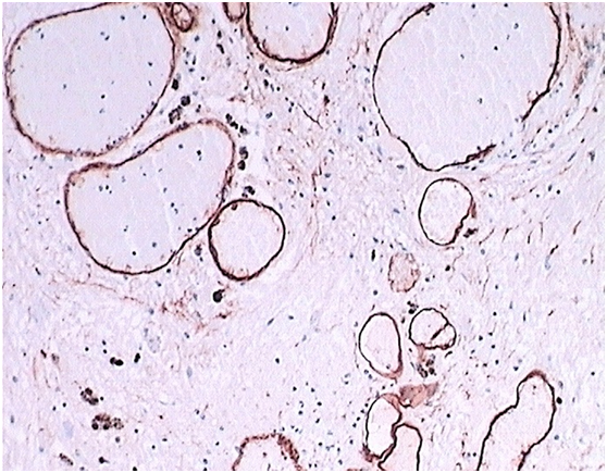 With microsurgical technique and the use of cavitron ultrasonic aspiration, the lesion was carefully dissected out and totally removed, measuring apprimately 5cm. Histological examination showed a vascular malformation, hemangioma of venous type (Figure 9 &10).