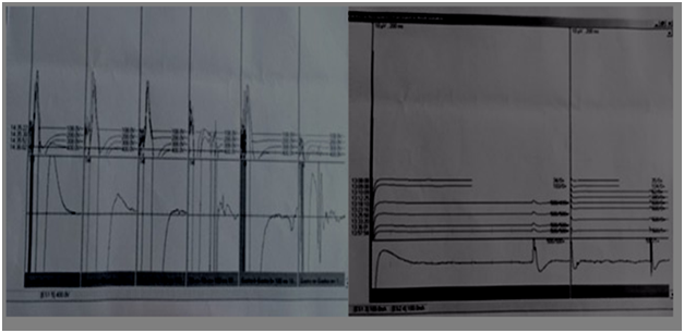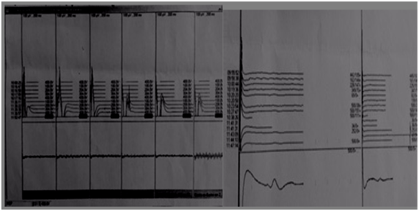 As mentioned before, in the present case with the intramedullary lesion at Th2-Th5 level, the intraoperative neuromonitoring was done using a Nicolet Endeavor ( CR ) with : 1/ SEPs with stimulation of both posterior tibial nerves and recording at the paramedian postcentral region at the skull and 2/ MEPs with transcranial electrical stimulation gradually at 100, 200, 300 and 400V, and recording at both sides of quadriceps, anterior tibial and gastrocnemius muscles. At the beginning no sensory or motor potentials were recorded. After the opening of the dura and the decompression, sensory evoked potentials were recorded (Figure 11 & 12).