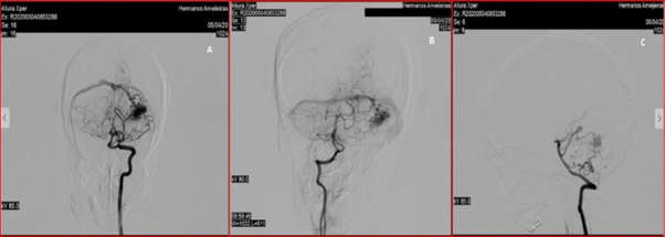 A 26-year-old female patient, Karnofsky index4 90 points. She abruptly presented intense headache, vomiting, and photophobia. In the initial brain computed tomography (CT scan), haemorrhage is objective in the left cerebellar hemisphere, entering the Intensive Care Unit. At 24 hours, it presents degradation of the state of consciousness due to obstructive triventricular hydrocephaly. It is decided to place peritoneal ventricular derivative system with medium-pressure opening valve and evidence of neurological event resolution. Within 15 days of the onset of symptoms in the study of Angio CT scan, arteriovenous malformation (AVM) is diagnosed in the left cerebellar hemisphere, DSA (Figure 1 A, B and C) and two-dimensional tissue perfusion are performed (Figures 2 & 3).