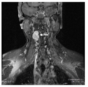 After one year, the patient is reached and a cerebral MRI is performed, which showed a total resection of her two giant meningiomas, without recurrence (Figures 4&5). Neck lesions in situ. The patient refused cervical surgery knowing the possible risks of her decision.