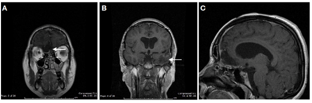 Figure 4 (A,B,C) Postoperative T1 Gadoline enhanced coronal and sagittal MRI shows complete resection of olfatory grove meningioma and left sphenoidal meningioma. White arrows show the place where the tumors were previous to surgical resection.