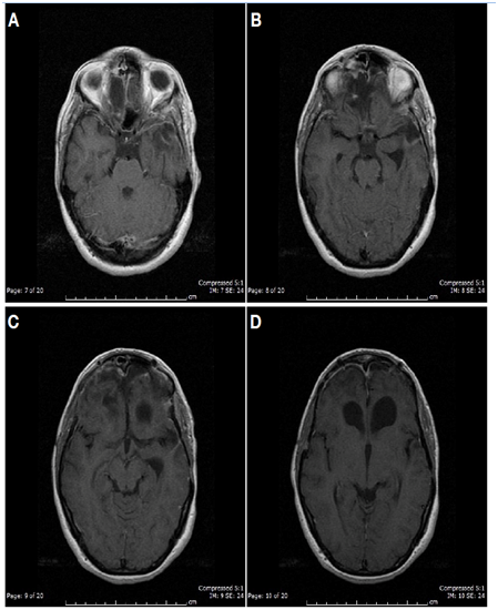 Figure 5 (A-D) Postoperative T1 Gadoline enhanced axial MRI shows complete resection of both large meningiomas and no ischemic sequelae.