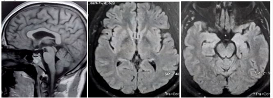 Observation: A 35-year-old man progressively presented gait disturbances with postural instability leading to falls. On examination: Akineto-rigid parkinsonian syndrome (PS), primarily axial, associated with vertical gaze palsy, head backwards tilt and postural instability without tremor. There was a slight frontal syndrome, irritability and dysphagia. The biological assessment (autoimmunity, copper and CSF testing) was correct. Brain MRI of the onset [figure1] did not show mesencephalic atrophy, nor signal abnormalities of overload disorders (Wilson's disease (WD), neuroferritinopathy). The patient underwent a therapeutic test (L-dopa 300 mg/d) over three months, without significant improvement. We then added ropinirole, rivastigmine and paroxetine. Despite the given therapeutics, no remarkable changes were noticed.