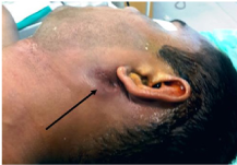 A 24Yr old male non smoker without any known co-morbidities presented with painless swelling of left parotid region of four months duration which was insidious in onset and gradually progressive. There was no history of any constitutional symptoms, facial nerve involvement and rapid increase in the size of swelling. There was no other significant family or personal history. On examination, the swelling was 5 x 4cm, firm in consistency and fixed to the overlying skin just below the pinna and adherent to upper part of sternomastoid muscle. There was puckering of the overlying skin in the centre with surrounding areas of erythema and dark pigmentary changes. The facial nerve was intact. No other abnormality was found in the oral cavity, nasopharynx, larynx or the ears. There was no palpable enlargement of cervical lymph nodes. Routine biochemical lab tests were within normal limits (Figures 1 & 2).
