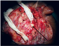 Figure 3 Facial Nerve was identified and secured with careful dissection. Deep lobe tumour can be seen inferior to the lower division of facial nerve (arrow).