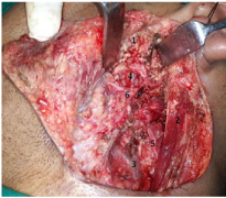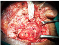 Figure 4 Intraoperative image showing: Deep lobe tumor of parotid being delivered1, sternomastoid muscle2, facial nerve3 and Spinal accessory nerve4.