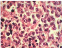 Figure 7 HPE Specimen (H&E, x200) - Infiltration of salivary gland parenchyma with atypical lymphoid cells having high N: C ration and moderate degree of nuclear pleomorphism.