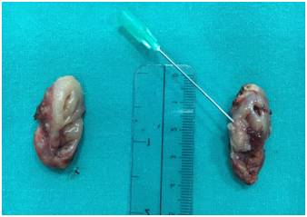 Figure 1 Gross specimen, right and left tonsils. Needle shows an exophytic grey, irregular surfaced tonsillar mass on the left tonsil.