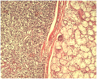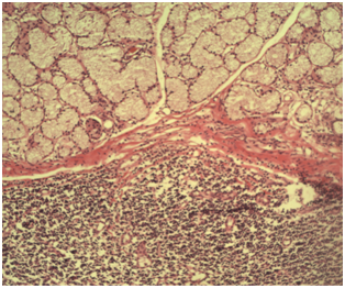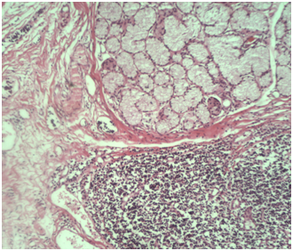 Figure 2 Tonsillar tissue with adjacent islands of heterotopic mucinous salivary gland acini (Histopathologic examination, H&E stain, Magnifications: ×100).