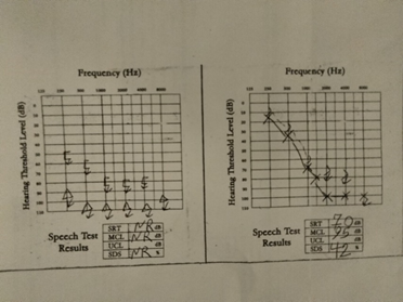 In unaided evaluations, the patient did not show any response in PTA, SRT, MCL, and WRS on the right ear while masking the left ear. On the left ear, the unaided SRT, MCL and WRS were 70 dB, 95 dB and 42%, respectively (Figure 3).