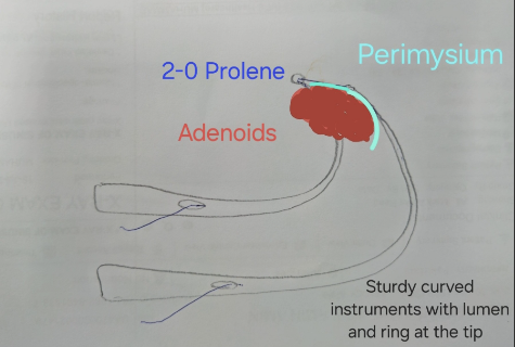 Adenoid Ensnaring:The thread is garlanded around one side of the adenoids, with one end of the thread being held on the instrument handle. The same process is repeated on the other side of the adenoids using the second instrument. Thread Tensioning:The thread is made taut by firmly holding one end and pulling the other end. The assembly is then pulled in a curvilinear motion while pressing against the back wall of the nasopharynx. This technique is expected to remove the adenoid tissue flush to the fascia layer as sharp shearing force is applied by the unbreakable thread.The resulting bleed can be controlled with gauze piece adenoid pack pressure soaked in dilute adrenalin leaving for a few minutes in nasopharynx.