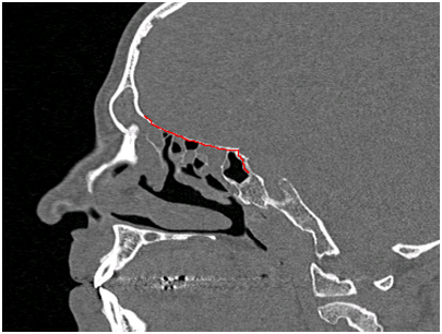 The rationale behind the preoperative treatment is the reduction of inflammation which will lead to less bleeding during the operation and therefore to more accurate dissection of the tissues.7 At the same time, the shrinkage of polyps and the reduction of mucosal edema will render the nasal cavities more accessible during endoscopic examination. It is now time for a second evaluation of the nose to decide in which nostril we will apply the dermoplasty technique. In the first three cases dermoplasty was applied in both nostrils. This resulted in a prolonged operation becoming cumbersome for the surgeon and dangerous for the patient. Then we decided to apply dermoplasty unilaterally planning to return to the contralateral nostril at a second stage. Our criterion as on which nostril to apply dermoplasty is the accessibility of the axilla of the middle concha which results in unobstructed insertion of the endoscope and the instruments in the middle meatus. Another effect of the preoperative treatment is the ability to study the anatomy of the ethmoidal labyrinth. At the end of the regimen the patient is submitted to a computed imaging (CT) of the nose and paranasal sinuses. The study of the CT will provide us with information about the anatomy of the ethmoidal complex and any areas of danger like the optical nerve, the internal carotid artery etc. The study of the CT will also permit us to estimate the surface and the contour of the skin graft needed. The radiologist will measure the distance between the posterior end of the frontal ostium and the sphenoid sinus (including its roof) in the sagittal plane (Figure 1) and then he/she will proceed to the coronal plane to measure the sum of the length of the lamina papyracea, the fovea ethmoidalis and the middle or upper concha at ten points moving from the posterior rim of the frontal ostium to the sphenoid sinus (Figure 2). The combination of these measurements will give the surface and the contour of the skin graft needed.