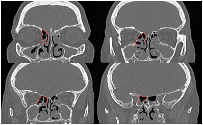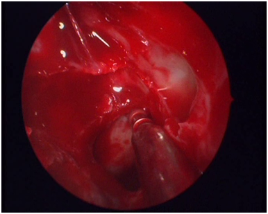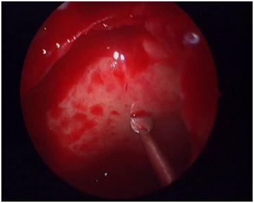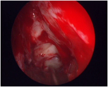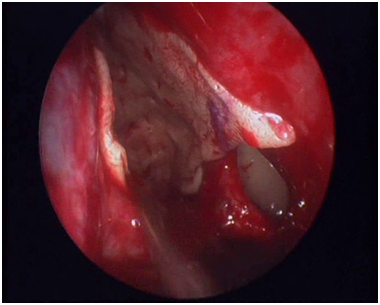 The posterior rim of the frontal ostium is chosen as the most anterior point of the ethmoidal roof accessible with a 0o endoscope as we try to complete the operation with this endoscope. After the induction of general anesthesia the operation begins. The first steps are typical of fess removing polyps and opening the ostia of the paranasal sinuses. The frontal wall of the sphenoid sinus is almost completely removed to the skull base making use among others of 15o a curved diamond DCR bur (Figure 3).