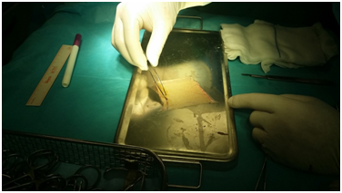 After preparing the bed (Figure 5) it is the time to receive the graft. We have already estimated the surface we need to cover by studying the CT. Usually a graft with dimensions 5x5cm will suffice. The thickness of the graft has also been already estimated at 0.15mm. The graft must be thin enough to contain only a thin slice of dermis. The optimal area for receiving the graft is the thigh, preferably its inner surface. We take the graft from the ipsilateral leg by the use of an electric dermatome. Prior to insertion, the graft must be trimmed to acquire the proper contour. Also, multiple cuts are performed on its surface so as to prevent air and blood clots to accumulate between the graft and its bed. Furthermore, these cuts will allow small remnants of mucosa to find their way into the nasal cavity preventing the formation of mucocele (Figure 6). After completing trimming, the graft is wrapped around a sterile paper and is inserted inside the nose (Figure 7). After the insertion of the graft no further actions must be taken inside this nostril. No packing of any kind must be inserted. The graft remains in its position due to viscosity rather than any other supporting force.
