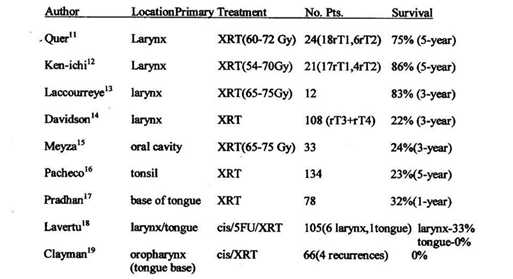 Surgery at the primary site, neck dissection, reconstruction and (rarely) surgery for metastases: This is the cornerstone of treatment for cure in recurrent head and neck cancer that usually follows prior surgery, chemotherapy, radiation therapy or any combination of these therapeutic modalities. The literature has demonstrated that surgical salvage yields the best results. In a study by Goodwin, et al in a large number of patients has found that for recurrent stage I, there is a 73% survival at 2years; recurrent stage II – 67%, recurrent stage II – 33%, and recurrent stage IV – 22%. This was based on an analysis of 32 published reports.1,5 The study concluded that survival depends on the stage of the recurrence and not on the original stage, and the location of the primary plays a major role in the success of the salvage. Evidently, the tongue base and the pharynx are the most difficult sites to salvage. Surgery for earlier laryngeal cancer such as T-1 lesions yields a disease-free survival of over 90% and for T-2 ranging between 80-90%. These are usually managed by endoscopic LASER partial laryngectomies including cordectomies, supraglottic laryngectomies and other endoscopic procedures. Open laryngeal surgeries still have a role today in the management of recurrent cancers in the form of supraglottic, fronto-lateral, hemi-laryngectomies, or supra-cricoid laryngectomies with good swallowing and acceptable voice results.6,7
