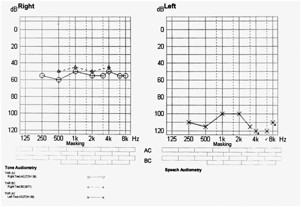 - The audiogram reveals a profound sensorineural hearing loss (SNHL) in the left ear and a moderate, mainly sensorineural loss on the right side. The clinical picture is complicated by two concomitant pathologies: right ear infection, making it difficult for the patient to wear the hearing aid; and a profound SNHL in left ear, unsuitable for a hearing aid.