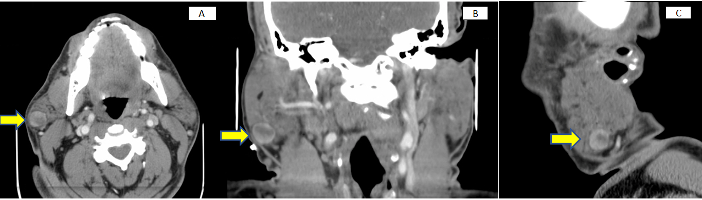 A 57-year-old male presented to the outpatient office with a chief complaint of a right parotid mass. The mass was asymptomatic, had been present for 10 years, and had recently started enlarging. The patient was given a course of antibiotics by his primary care physician, with no change in size or quality of the mass. On exam, there was a 2cm well-defined, mobile mass in the right parotid gland, clinically within the parotid capsule. A computed tomography (CT) scan of the soft tissues of the neck with contrast revealed a 1.7 cm well-circumscribed, enhancing nodule within the superficial lobe of the right parotid gland (Figure 1). No other head and neck lesions or enlarged cervical lymph nodes were identified.