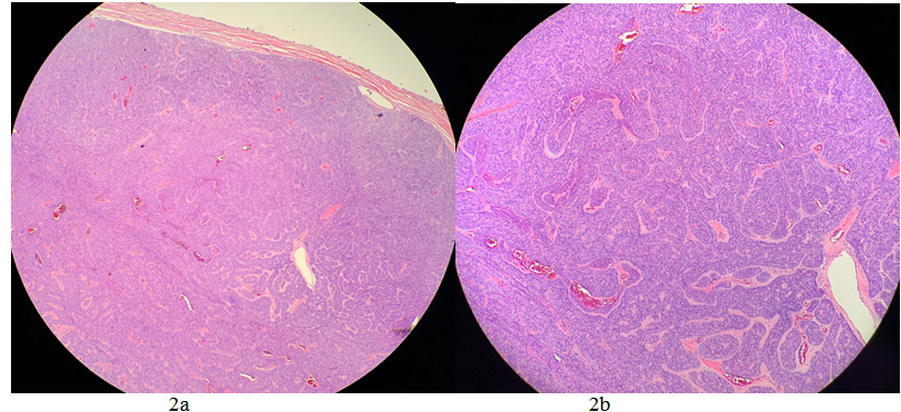 The World Health Organization defined BCA as a benign neoplasm composed chiefly of basaloid cells with a prominent basal cell layer and distinct basement membrane like structure with no myxochondroid stromal component. Histologically they are divided into solid, tubular, trabecular, and membranous types.2 The solid type is the most common.2 Malignant transformation is rare, but has been reported in BCA.3,6 Malignant transformation is most common in the membranous subtype, but has been reported in other subtypes as well.3,6 Malignant transformation manifests as a malignant basaloid tumor (Figure 2a & 2b). However, there are three case reports of non-basaloid carcinoma arising from BCA.6 The higher propensity for membranous BCA to undergo malignant transformation is likely due to its incomplete capsule formation and multifocal microadenomas.2 Recurrence rates for solid, tubular, and trabecular BCA approach zero. Membranous BCA, however, has a reported recurrence rate of 24-37%.1,3,6