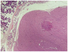 A 45 year old male was presented at the Otolaryngological Department with a small swelling in the right parotid region. No pain or signs of infection were present. Clinical examination revealed a well defined soft mass with no palpable cervical lymph nodes. CT and MRI showed a well circumscribed mass with a major probability of a benign tumor in the superficial lobe of the right parotid gland. The patient underwent superficial parotidectomy with complete tumor excision and preservation of the facial nerve under general anaesthesia.
