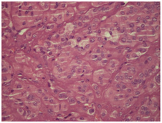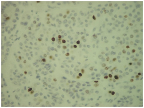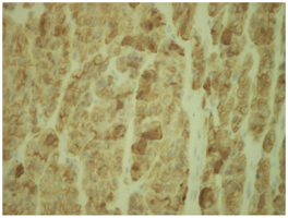 Pathological examination of the tissue sections revealed a 1,5 cm circumscribed neoplasm with tan color partially encapsulated, covered by healthy parotid tissue. A lymphe node 2,1 cm was also present but had non specific reactive changes. The neoplasm had a nested pattern of growth suggesting an oncocytoma. It composed of cells with vesicular nuclei, with prominent nucleoli and abundant granular acidophilic cytoplasm. (Figure 1) (Figure 2). Enhanced mitosis, cytological atypia, moderate nuclear pleomorphism and necrosis were noted. Focally an abnormal circumference with connective tissue and fibrous elements was also present suggesting that this neoplasm has agressive histological features with malignant potential. Immunohistological staining pattern showed that the neoplastic cells had a Ki67 positive at 8% (Figure 3), positve for ker 8/18 (Figure 4), positive-negative for p63 while were negative for ker 14, SMA, CEA, TTF-1, CD31, calcitonin, EMA, GFAP, and S100 staining.