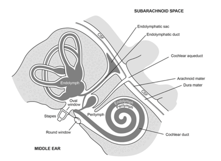 Figure 1 Demonstration of the communication between cerebrospinal fluid (CSF) and perilymph via the cochlear aqueduct. Adapted from “SCUBA Medicine for otolaryngologists: Part Ⅰ. Diving in to SCUBA physiology and injury prevention.” By Mallen JR, Roberts DS. 2019, Laryngoscope, 9999, 3.