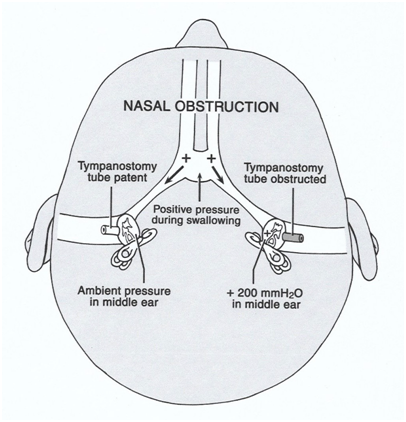 Figure 3 Cartoon showing the pathogenesis of persistent alternobaric vertigo in our patient who had chronic nasal obstruction, the Toynbee Phenomenon, and a unilaterally obstructed tympanostomy tube that created high positive middle-ear pressure. Adapted from “Case Report: Persistent Alternobaric Vertigo at Ground Level due to Chronic Toynbee phenomenon.” by Bluestone CD, Swarts JD, Furman JM, et al. 2012, Laryngoscope, 122(4):8.