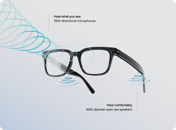 The Nuance Audio™ Hearing Aid incorporates noise reduction and beamforming algorithms, with user control options. Options include a smartphone app, a physical volume and on/off button on the temples, and an optional remote control. As envisioned decades ago, the beamforming algorithms use spatial separation between microphones and advanced software processing to achieve a high directivity index, maximizing the signal-to-noise ratio for sounds originating in front of the wearer Figure 1. The Nuance Audio™ Glasses transmit sound to each ear through tiny speakers embedded in the frames, without requiring anything to be worn in the ear, or to enter the ear canal, making them the first true open-ear air-conduction OTC hearing aid.