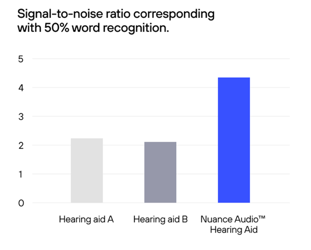 Nuance Audio™ Hearing Aid significantly improved speech-in-noise ability. Nuance Audio™ Hearing Aid out-performed the two commercially available prescription hearing aids.