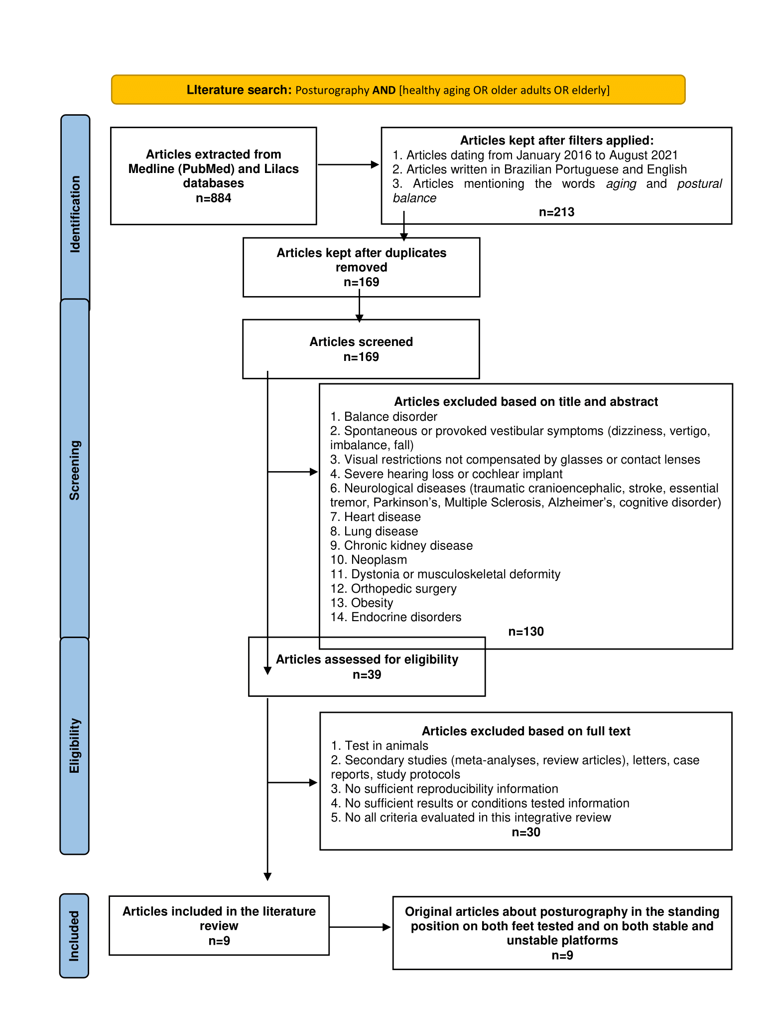 Initially, only studies in Brazilian Portuguese and English published in the last five years (from January 2016 to August 2021) and including specific subjects of aging and postural balance were selected. Articles were corrected for duplicity.