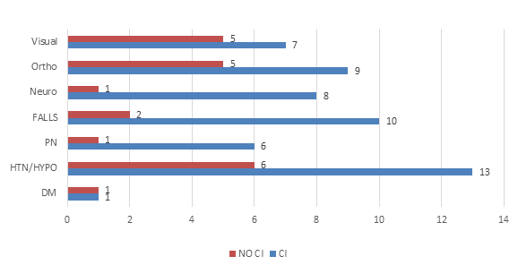 More than half of the participants (22/32; 68.8%) had abnormal cognitive scores on the Cognivue®. Of the 22 participants, more than half (59.1%) had either hypertension, hypotension and about 40.9% had significant orthopaedic medical history, including osteoarthritis, knee, or hip replacement. One-third of the participants with abnormal cognition had significant non-corrected visual deficits (31.8%) such as cataracts. About 45.5% had a fall in the previous year and approximately 36.4% had a neurologic history including stroke, transient ischemic attacks, neuropathy, Parkinson, seizures/epilepsy, and head injuries. Six participants (27.3%) had polyneuropathy while one participant (4.5%) had Diabetes Mellites. When compared with participants without cognitive impairment (CI), those with CI had a 3X (6/22, 27.3%; 1/10, 10%) greater proportion of polyneuropathy (PN), 2.5X (10/22, 45.6%; 2/10, 20%) more fallers, and 3.5X (8/22, 36.4%; 1/10, 10%) more participants with a significant neurological history (Figure 1). Although there were fewer reported orthopaedic and non-corrected visual deficits in participants with CI, these comorbidities including PN, fall and neurological history were still confounding variables that had to be adjusted for in regression analyses assessing relationship between cognition and fall risk.