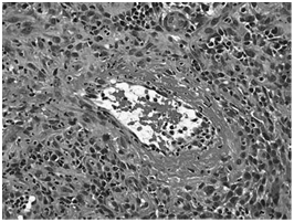 Friedrich Wegener first clearly defined WG in 19392 as a systemic disease characterized by necrotizing granulomas with vasculitis of the upper and lower respiratory tract, systemic vasculitis and focal necrotizing or proliferative glomerulonephritis. The prevalence of Wegener’s is estimated to be 3 cases per 100,000 and the mean age at diagnosis is 55years. In this interesting case report we describe a 22-year-old female patient who presented to the ENT department for tonsillectomy. In this patient anterior rhinoscopy revealed asymptomatic septal perforation. During further evaluation of the patient, a biopsy around the septal perforation was taken and sent for histopathological examination. Histopathology revealed necrotizing granulomata, multinucleated giant cells and vasculitis. The HPE picture was suggestive of a granulomatous nasal disease. On high suspicion of Wegener’s granulomatosis, a ANCA (Antineutrophil cytoplasmic antibody) was ordered (Figure 1).