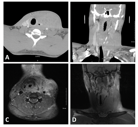 Figure 1 Complex 4.6 x 7.4 x 7.2 cm centrally necrotic enhancing mass centered about the inferior left sternocleidomastoid muscle causing slight airway deviation to the right. MRI shows mass extending medially to involve the left parapharyngeal space, visceral space, and left retropharyngeal space at the level of the thyroid cartilage. A) Axial CT B) Coronal CT C) Axial MRI D) Coronal MRI.