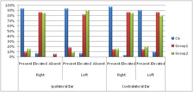 Acoustic reflex Testing (ART): Ipsilateral Reflexes: Acoustic reflex in right ear was present in 93.3% of subjects in CG, 9.1% of subjects in group 1 and 15% of subjects in group 2 however, elevated in 6.7%, 86.36% and 85% of subjects in CG, group 1 and 2 respectively. Whereas in left ear, the acoustic reflex was present in 93.3%, 18.8% and 10% of CG, group 1 and 2 respectively whereas elevated in 6.7% of subjects in CG, 81.82% of subjects in group1 and 90% of subjects in group2 as shown in Graph1. On applying Pearson’s Chi-square test, highly significant (p<0.01) differences were observed among three groups.