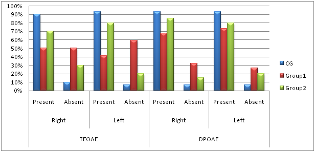 Otoacoustic Emission (OAE): TEOAEs were found to be present in 90%, 50% and 69.2% of the subjects in CG, group 1 and 2, whereas absent in 10%, 50% and 30.8% of the subjects in CG, group1 and 2 respectively in right ear. In left ear, TEOAEs were present in 93.3% of the subjects in CG, 40.9% of the subjects in group1 and 80% of the subjects in group2 whereas absent in 6.7% of the subjects in CG, and 59.1% of the subjects in group1 and 20% of the subjects in group2 as shown in Graph2. There was a highly significant difference (p<0.01) among three groups in both left and right ears.
