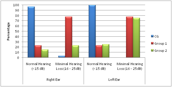 Right Ear: In CG, 96.7% of the subjects had normal hearing and 3.3% had minimal hearing loss. However, in group1, 22.7% of the subjects had normal hearing and 77.3% of the subjects had minimal hearing loss whereas 15% of the subjects had normal hearing and 85% of the subjects had minimal hearing loss in group2 as shown in Graph3. Results revealed highly significant (p<0.01) difference between three groups viz.CG, group 1 & 2.