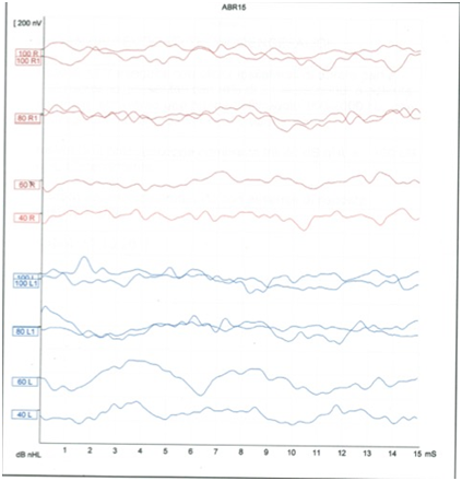 Figure 1The image shows the ABR with no structured waves in both sides. The signal is not transmitted at 40 and 60 Db, at 100 dB in the left side seems to appear a wave I.