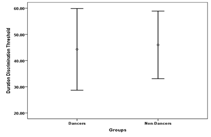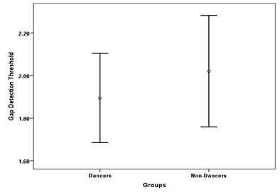 Present study included 15 healthy Indian classical dancers (experimental group) and 15 healthy non dancers (control group). All the subjects participated in the study were having normal hearing revealed by pure tone audiometry, normal middle ear functioning revealed by tympanometry and reflexometry. All the participants were having normal outer hair cells functioning shown by oto-acoustic emission. Participants having any neurological and otological problem at the day of testing were excluded from the study. All the dancers participated in the present study were trained dancers in Indian classical dance (Bharatnatyam and Kathak) having a minimum experience of 4 years. All the dancers were regular practitioner of dance and they perform dance minimum 3-4 hours per week. All the dancers participated in the study, regularly attends stage shows at different events. The participants in control group (non-dancers) had not underwent any dance training neither they had performed any dance in any cultural activities. To assess auditory temporal resolution skill in dancer and non-dancer, Gap Detection Test (GDT) and Duration Discrimination of Pure Tone (DDT) were used in the present study. MATLAB software using maximum likelihood procedure was used to investigate these tests among dancers and non-dancers. Gap detection threshold was investigated using 750 milliseconds of Gaussian noise with gap in the center. Gap duration was varied according to subject performance using maximum likelihood procedure. The noise had 0.5 milliseconds cosine ramps at the beginning and end of the gap. In the three alternative forced choice task, the reference stimulus was always a 750-millisecond white noise without gap, whereas the variable stimulus contained a gap. We took the minimum gap duration required to perceive a gap in noise as the threshold. In duration discrimination using pure tone (1000Hz), we measured the minimum difference in duration required to perceive the two otherwise identical stimuli, using maximum likelihood procedure. The duration of the standard tone was 250 milliseconds. The duration of the variable tone was changed based on response of the participants. We used two alternative forced choice procedures in which the participants were asked to indicate which tone was longer in duration. The collected data were tabulated in IBM SPSS statistics software (version 20) for further analysis of the data and to compare outcomes of tests between dancers and non-dancers.