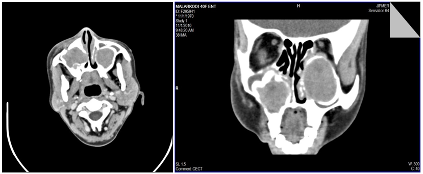 On examination, a 7-8cm sized non-tender, immobile, smooth surfaced, hard mass was palpated beneath the right nasolabial fold. Another mass around 1-1.5cm in size was palpated beneath the left nasolabial fold (Figure 1). Anterior rhinoscopy revealed a round, mucosal-covered mass extending along the floor and lateral wall of nose into the right nasal vestibule. No proptosis or extra-ocular muscle involvement was noted. Examination of the oral cavity was unremarkable except for a bulge in the upper gingivolabial sulcus on right side. No Cervical adenopathy was apparent.