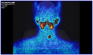 Figure 3 Tc-MIBI radionucleotide uptake study revealed an active parathyroid adenoma. Normal uptake in the submandibular gland is also noted.