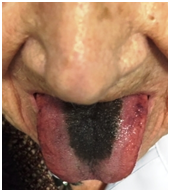 Black hairy tongue (BHT), also known as lingua villosa nigra, is a rare but benign and painless condition. Its clinical expression is like a blackish carpet of the dorsal surface of the tongue (Figure 1), usually in the posterior two-thirds anterior to the circumvallate papillae.1 Usually it does not affect the tip or the sides of the tongue, and it represents a particular form of a wider condition called hairy tongue, for which other colorations have been described (brown, yellow, and green).2 It is more common in adult patients but it has been described in pediatric patients.3 BHT is usually asymptomatic and its principal associated problem is of aesthetic order. Sometimes patients may complain of nausea, halitosis, altered taste, tickling of the tongue.4