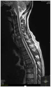 An MRI Whole spine was performed following his PET-CT given the extent of vertebral disease. Abuttment but not compression of the cord at the level of T6 was seen (Figure 5). Two weeks following this patient developed some neurological symptoms attributable to progression at this site. Multiple wedge fractures and imminent compression of the cord was seen. A neurosurgical opinion was sought and this patient was deemed not to be for surgical intervention. Twenty Gray in 5 fractions of palliative radiotherapy was delivered to T5, T6 and T7 vertebrae.